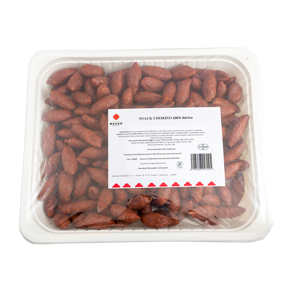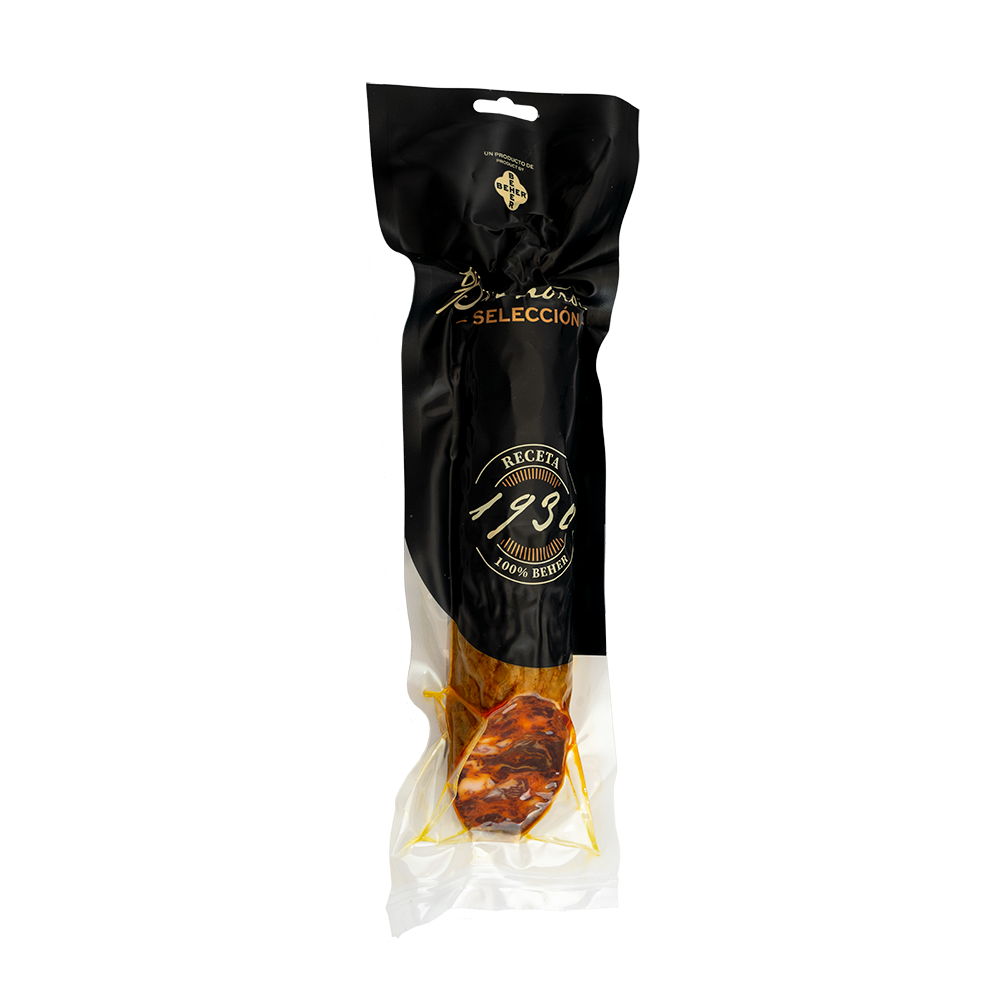 Il Chorizo 'Cular de Bellota' è insaccato in budello naturale, mantenendo la tradizionale autenticità nella sua preparazione. La stagionatura di circa 4-5 mesi permette ai sapori di svilupparsi pienamente, risultando in un chorizo ricco e gustoso. Questo salume è perfetto come antipasto, tagliato a fette sottili, o come ingrediente per arricchire piatti spagnoli tradizionali.