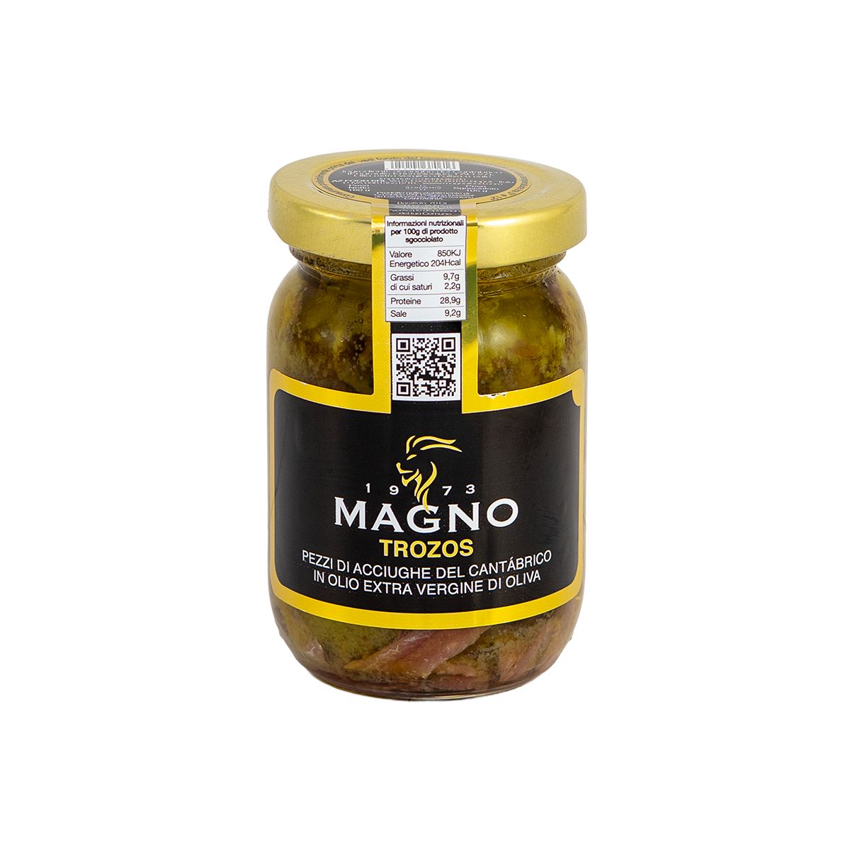 L'aperitivo iberico Gilda di Magno 1973 è il pintxos originario, il primo ad apparire sui banconi dei locali baschi. Tipico dei Paesi Baschi e della Spagna settentrionale, il Gilda rappresenta una versione più elaborata ed evoluta delle classiche tapas, costituendo un'opera culinaria in miniatura sia per il palato che per gli occhi. La confezione in latta di Magno 1973 contiene 6 spiedini, ognuno composto con cura e precisione. Ogni spiedino include 2 olive ripiene di peperone, 1 peperoncino verde dolce ed 1 acciuga, infilzati in un ordine specifico: prima un'oliva ripiena, poi il peperoncino, seguito dall'acciuga. L'irroramento generoso con olio evo di alta qualità completa la preparazione. Gilda offre una combinazione di sapori intensi e contrastanti, con ingredienti di prima scelta come le acciughe sotto sale, le olive ripiene di peperone e i peperoncini. Questi stuzzichini non solo deliziano il palato ma sono anche un'opera d'arte culinaria in miniatura. Il packaging nero, elegante e sofisticato, con il logo distintivo di Magno 1973, aggiunge un tocco di lusso all'esperienza gastronomica. Un accompagnamento ideale per il Gilda è un buon bicchiere di vino bianco (txakoli), un rosato oppure il vermouth.