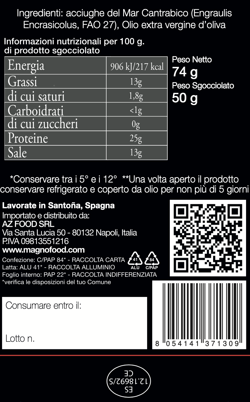 Acciughe del Cantabrico marinate in olio extra vergine d'oliva 100% italiano e aceto di vino. I nostri “Boquerones" sono filetti di acciuga del Cantabrico marinati nell’aceto di vino e conservati in un eccellente olio extra vergine di oliva 100% italiano. Serviti come aperitivo o antipasto, i Boquerones sono un piatto semplice e gustoso molto utilizzato nelle tapas spagnole. A differenza delle alici marinate nostrane, i Boquerones spagnoli sono molto più grandi e al palato risultano più carnosi e consistenti. L’olio extra vergine utilizzato dona al palato morbidezza e rotondità, che viene stemperata da una leggera nota di aceto, che lascia una gradevole sensazione di freschezza. Le acciughe sono conservate in frigorifero per garantire un basso grado di salinità rispetto ai prodotti standard. Devono essere mantenute a una temperatura compresa tra 5°C e 12°C e consumate entro 3 giorni dall’apertura.