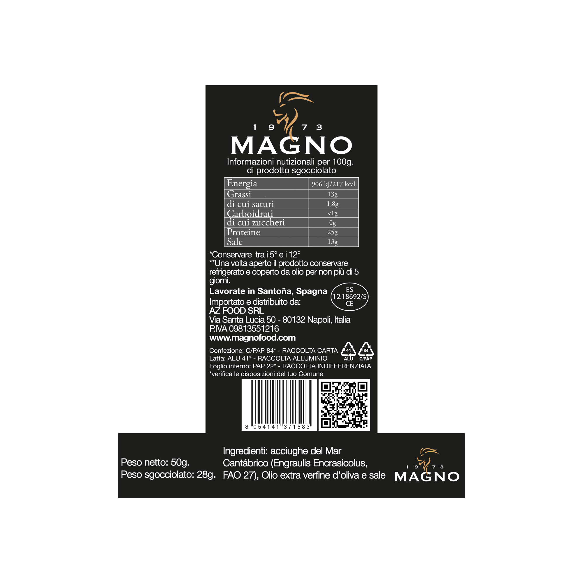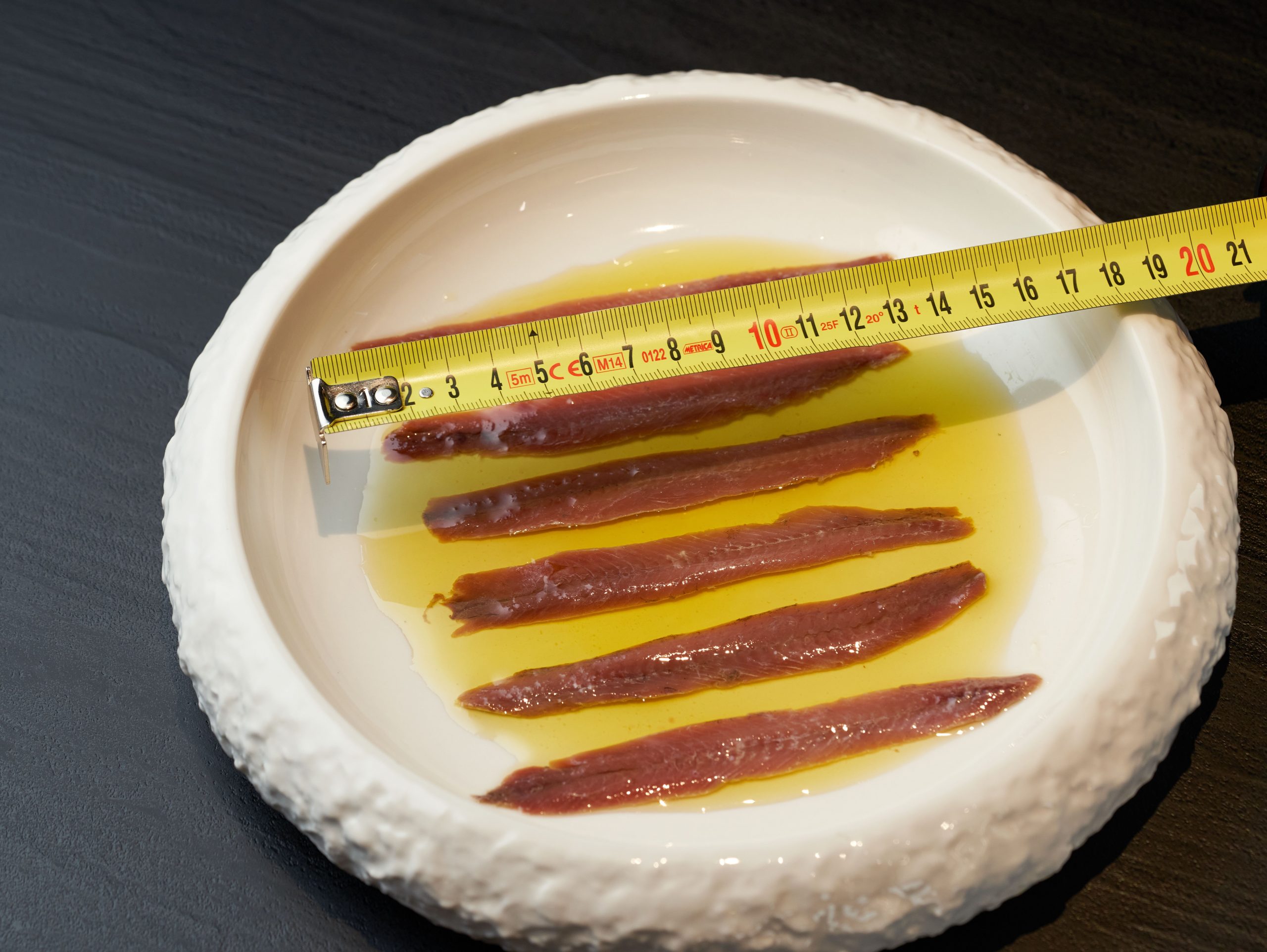 Acciughe del Cantabrico di taglia 'maxi', marinate in aceto di vino ed olio extra vergine d'oliva 100% italiano. Una confezione contiene 14 filetti. Peso netto 130 g. Peso sgocciolato 90 g.