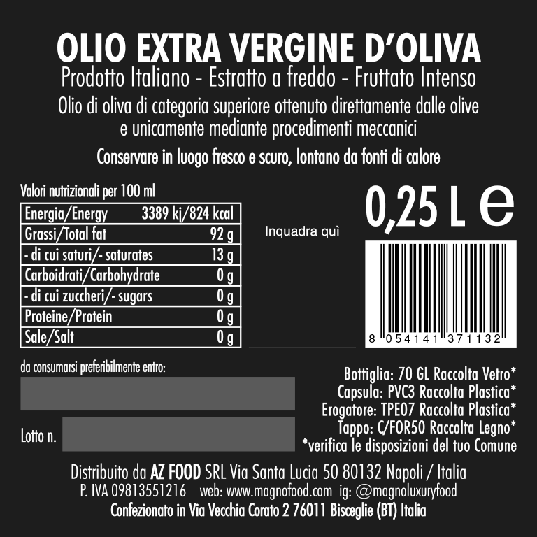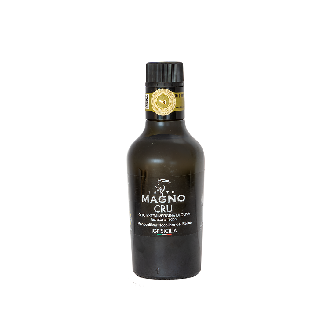 L'olio extravergine di oliva "CRU" è un prodotto di alta qualità che deriva da olive selezionate e lavorate con grande attenzione. La parola "CRU" deriva dal francese e significa "grezzo" o "non miscelato", indicando un olio che proviene da una singola varietà di olive e che non è stato mescolato con altri oli di diverse provenienze. Una categoria superiore di olio extravergine, corposo, pungente, con un gusto caratteristico e inconfondibile che racchiude tutti i sapori della Sicilia. Con il suo caratteristico colore verde, acceso e brillante, il nostro olio di oliva Extravergine Italiano è ottenuto dalla cultivar Nocellara del Belice, coltivata proprio nella regione siciliana. Le olive vengono selezionate una ad una, per garantire la massima qualità sin dalla materia prima. Questa categoria d’olio viene ottenuta unicamente mediante processi meccanici, mantenendo così inalterata la purezza delle olive. La bontà ed il pregio di questo olio, sono inoltri certificati dal marchio IGP