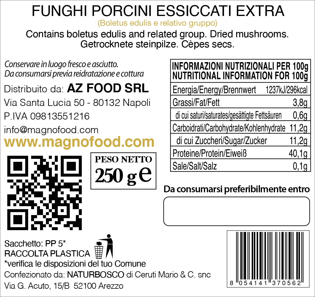 I nostri porcini, essiccati a poche ore dalla raccolta, sono di qualità extra, la migliore sul mercato. Rispetto ad altre tipologie di questo prodotto in commercio, la qualità Extra è frutto di una approfondita selezione e di una lavorazione attenta a confezionare un prodotto di altissima qualità: fette sottili e perfette di colore bianco e dal profumo intenso. I funghi sono raccolti nella zona di Fabro, nella provincia umbra di Terni e sono scelti per grandezza, forma e colore. Prima di consumarli, si consiglia la reidratazione in acqua tiepida per almeno mezz’ora. Vanno poi sciacquati da eventuale terriccio e strizzati. I nostri funghi essiccati temono l’umidità, pertanto si consiglia di conservarli lontano da fonti di calore, in un luogo fresco e asciutto. La durata è prolungata se i funghi sono conservati nel congelatore.