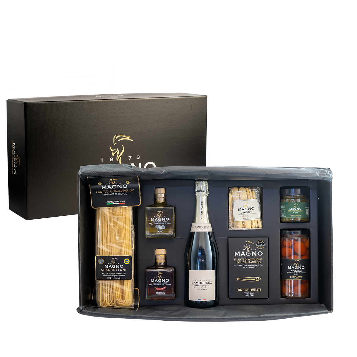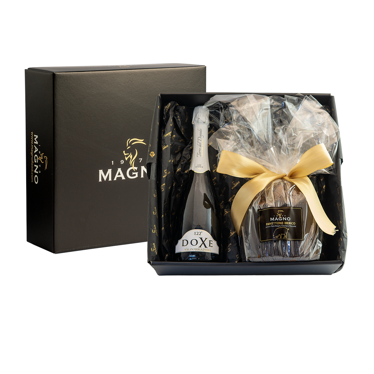 La “The Savory Sparkle Box” si configura come una proposta ad alto valore gastronomico, costruita sull’abbinamento tra lo Champagne Lamoureux Réserve Brut, espressione di raffinatezza enologica della Maison Lamoureux, e il nostro panettone iberico salato da 500 g, caratterizzato da una lievitazione soffice e da una farcitura premium a base di prosciutto Pata Negra, chorizo e pancetta di Bellota.